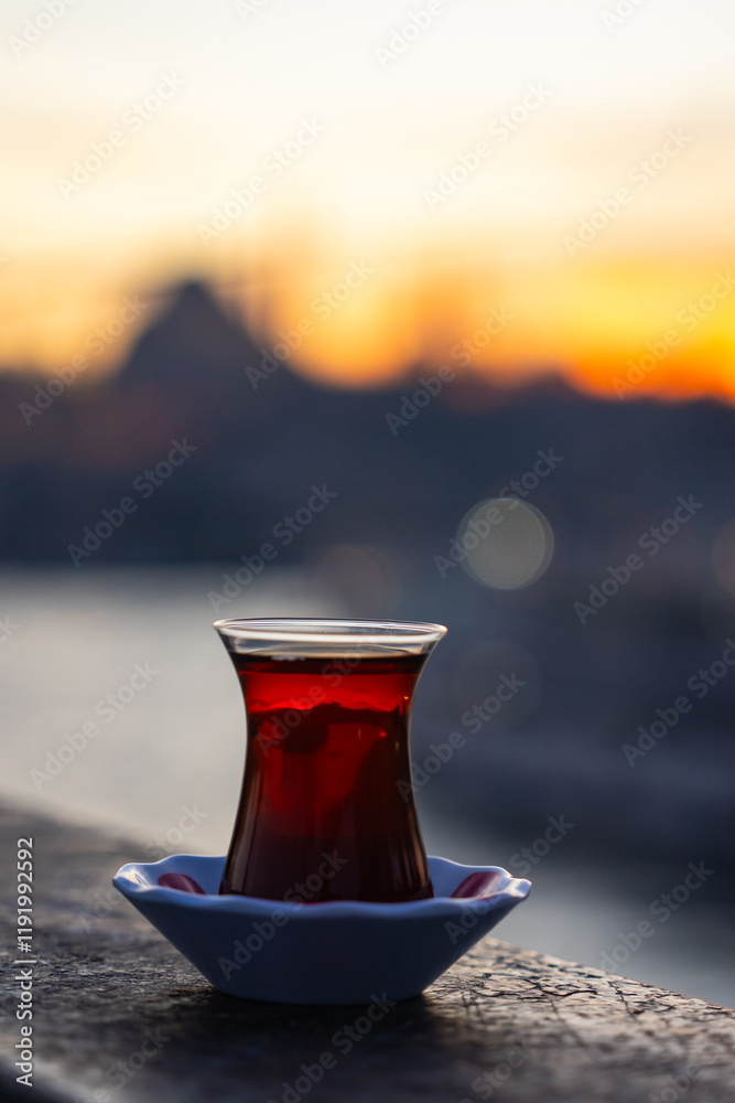 Turkish Tea (Türk Çayı) Photo in Front of Istanbul Symbol Suleymaniye Mosque, Galata Bridge Beyoglu, Istanbul Turkiye (Turkey)