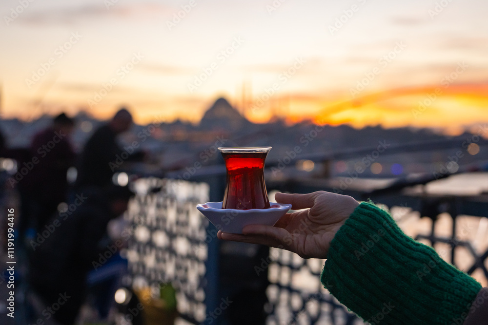 Turkish Tea (Türk Çayı) Photo in Front of Istanbul Symbol Suleymaniye Mosque, Galata Bridge Beyoglu, Istanbul Turkiye (Turkey)