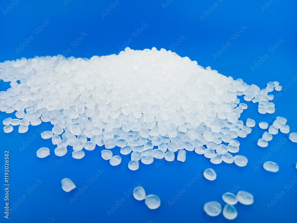 PP plastic pellets, virgin polypropylene polymer plastic granules poured into blue background, for product catalog design of industrial plastic manufacturing company profile