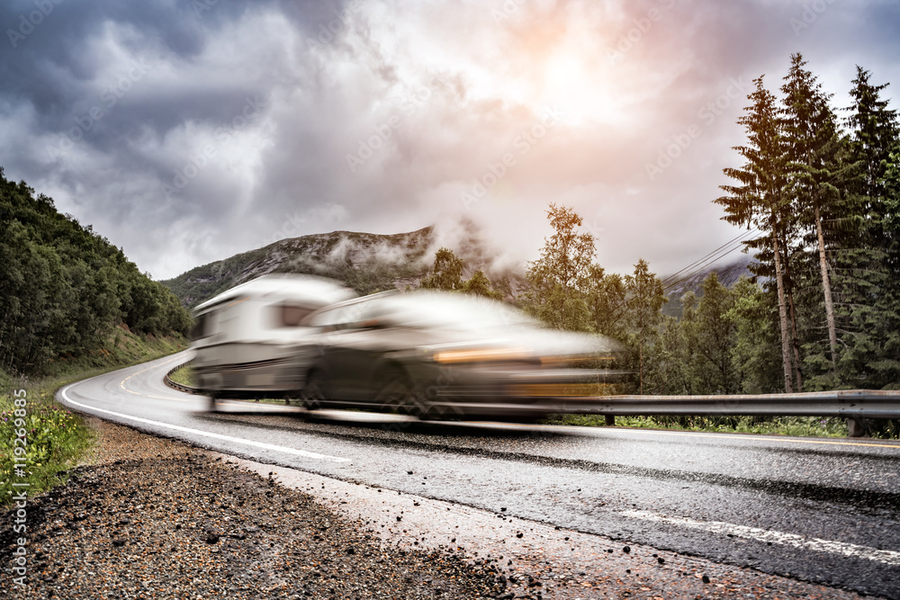 Caravan car trailer travels on the highway.