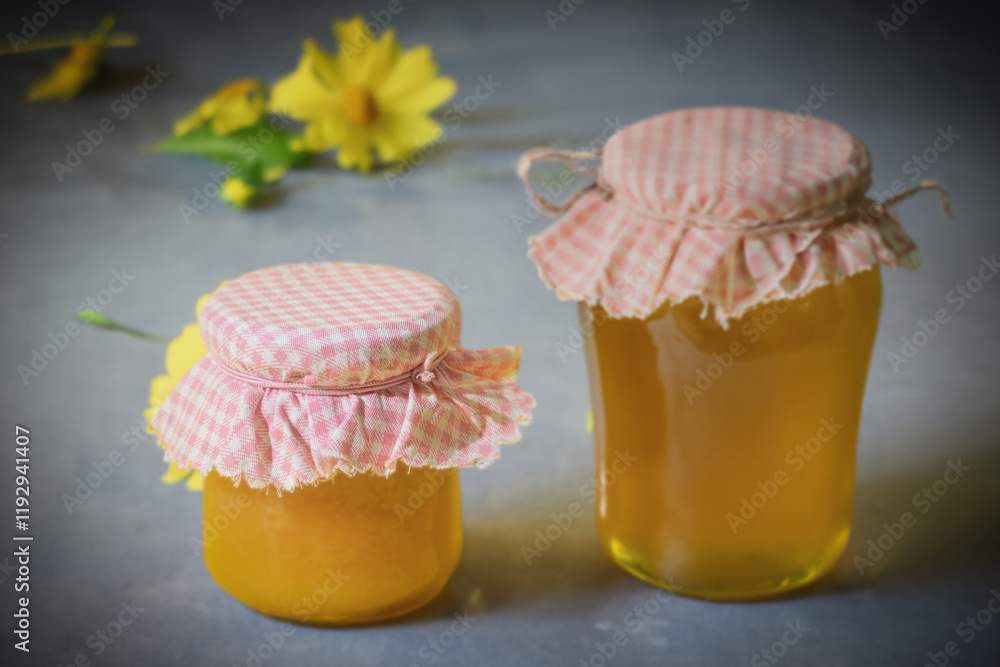 Jar of fresh honey. Honey jar, honey, bucket with leaves,