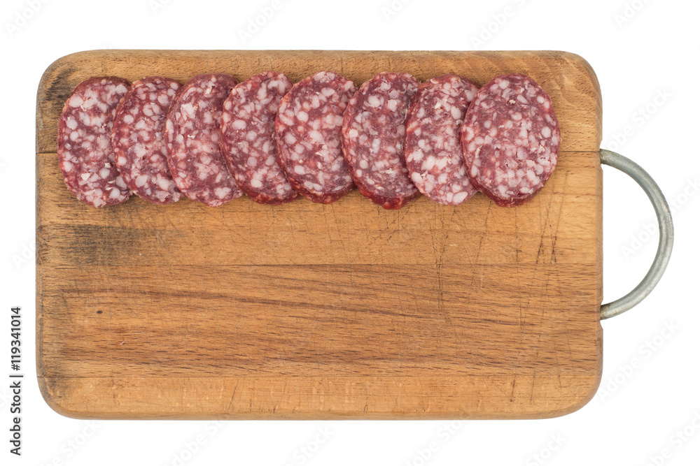 Sliced salami sausage on a cutting board. Isolated on white back