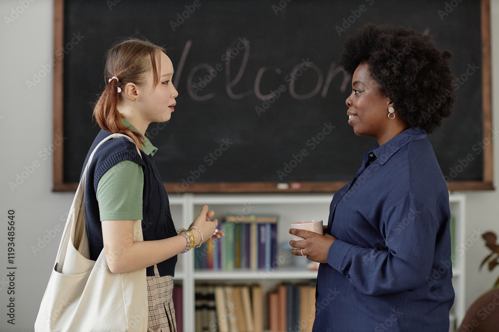 Side view portrait of young Asian girl talking to female teacher in classroom standing by blackboard in school