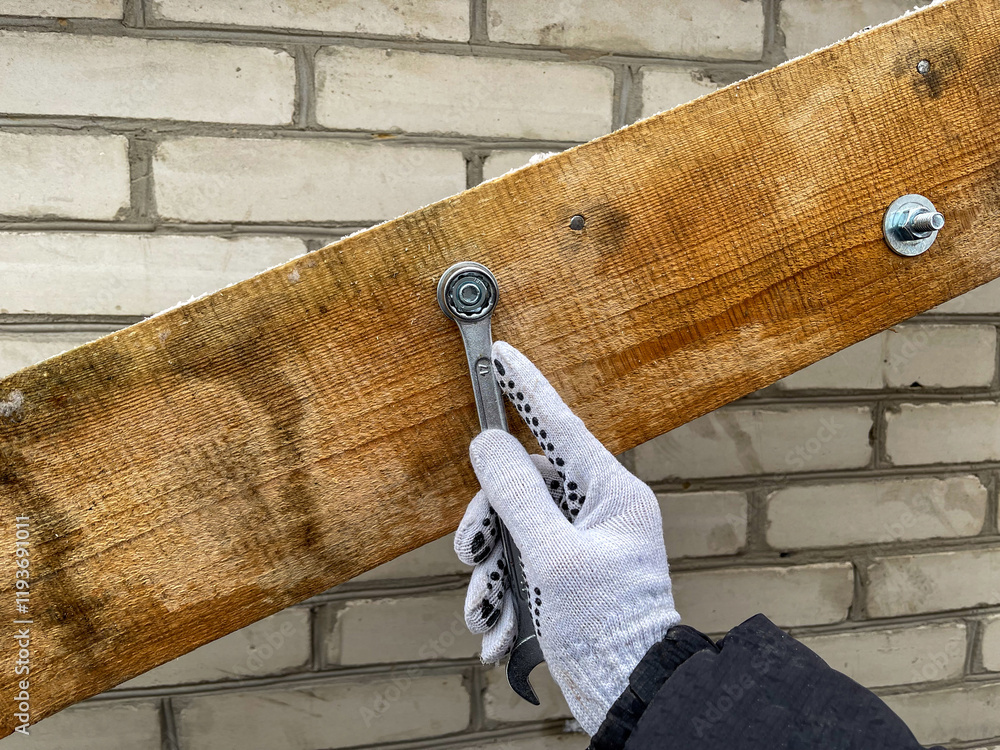 A person's hands firmly hold a wrench, tightening a part on a wooden beam.