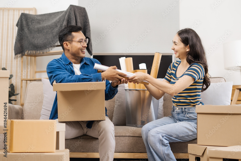 Young couple sitting on a sofa, helping each other pack, collecting clothes, putting items in boxes, feeling happy and excited while preparing to move into their new apartment