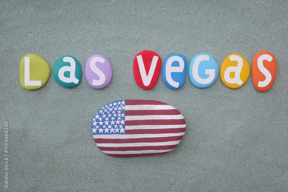 Las Vegas, creative souvenir composed with multi colored hand painted stone letters and USA flag over green sand