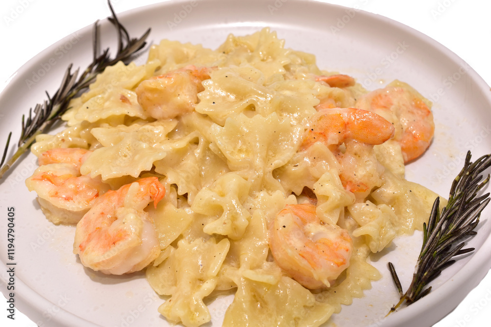 Italian cuisine. Farfalle pasta with shrimp meat and creamy sauce.