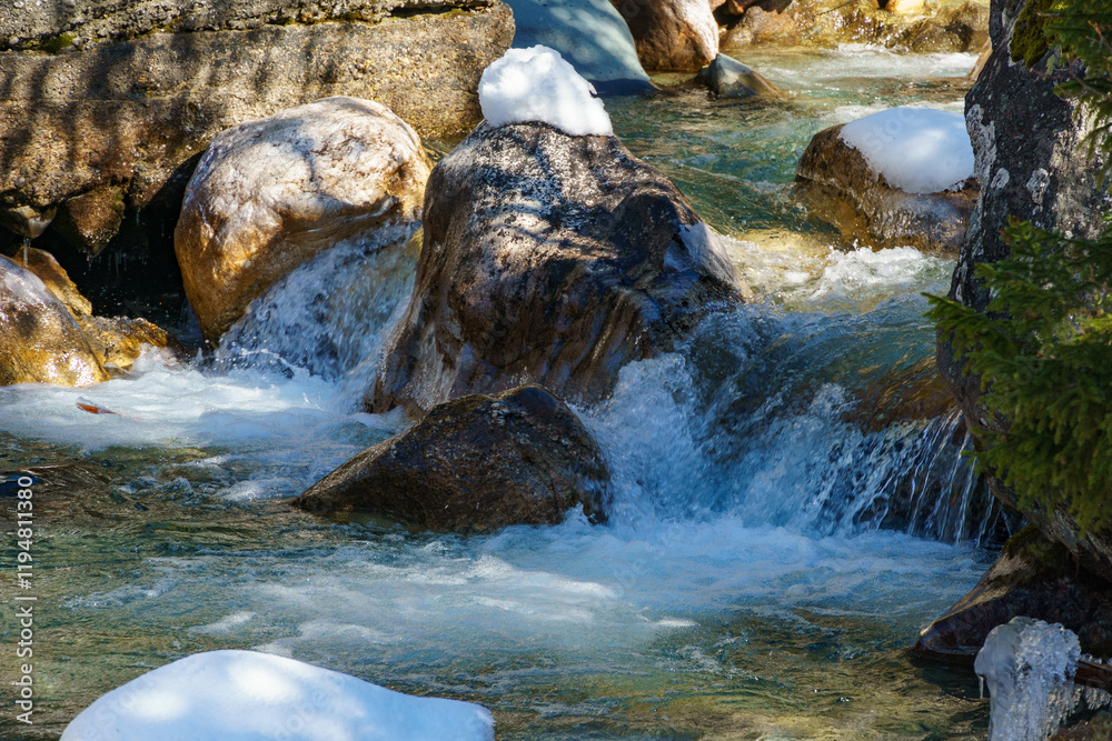 Beautiful stones with ice. Mountain river from glaciers makes its way through the big rocks in the Teberdinsky National Park. Dombay, Karachay-Cherkessia, Russia, Gonachkhir Gorge