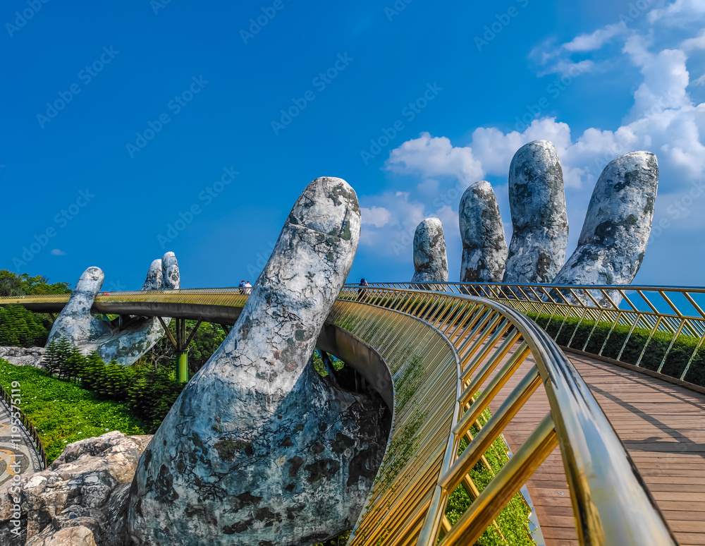 Golden Bridge in Ba Na hills, Da Nang, Vietnam on a sunny day. Lifted by two giant concrete hands. Iconic world famous bridge in the mountains