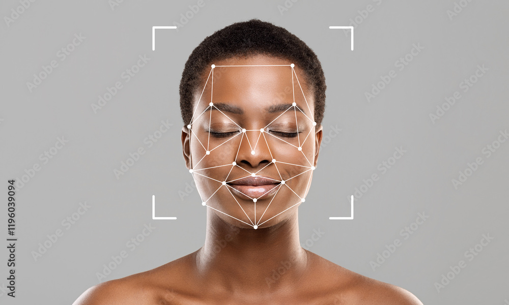 A person with closed eyes shows a calm expression as a facial recognition overlay highlights unique facial features. The background is neutral, emphasizing the subject and technology used.