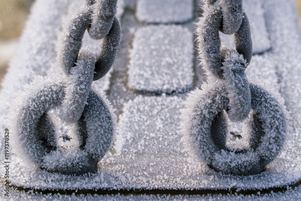 Kettenschaukel im Winter. Keine Kinder auf dem Spielplatz. Raureif ist an der Kette.