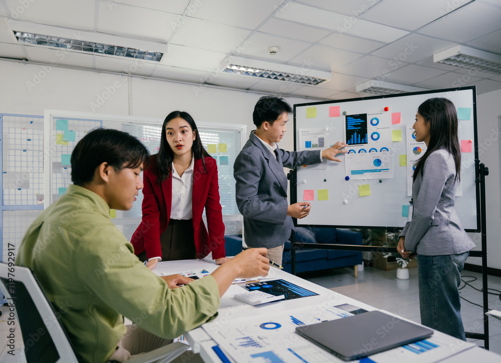 Group of young asian professionals reviewing marketing data on a whiteboard, actively discussing strategies and collaborating to achieve business objectives