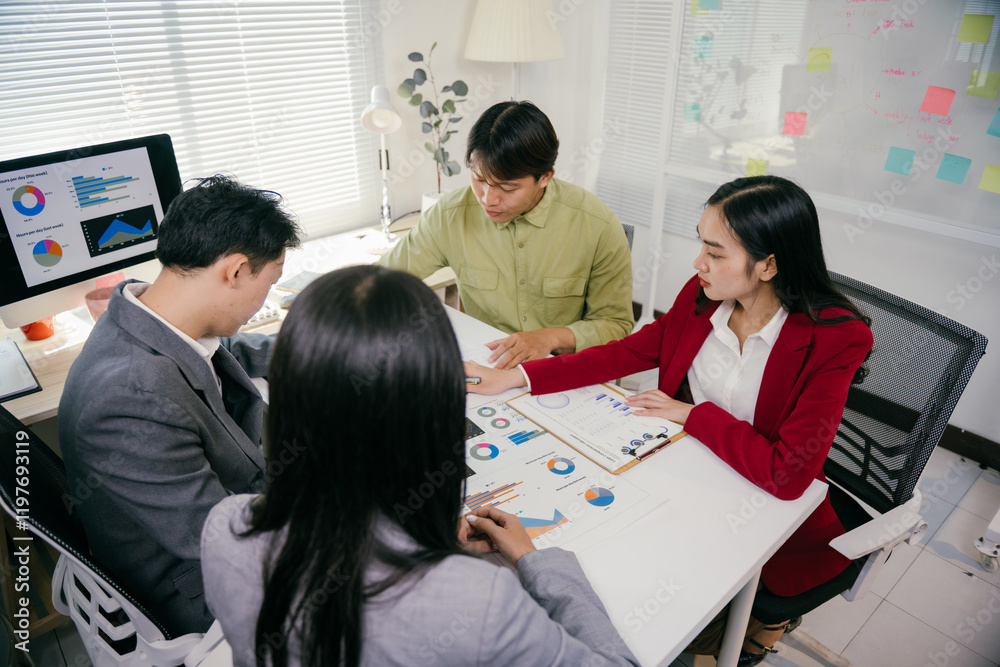 Four asian businesspeople are sitting around a table, collaborating on analyzing financial charts and graphs, developing growth strategies during a productive office meeting