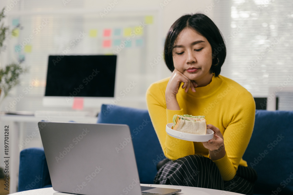 Tired businesswoman takes a break from work, eating a sandwich on her office couch, glancing at her laptop screen