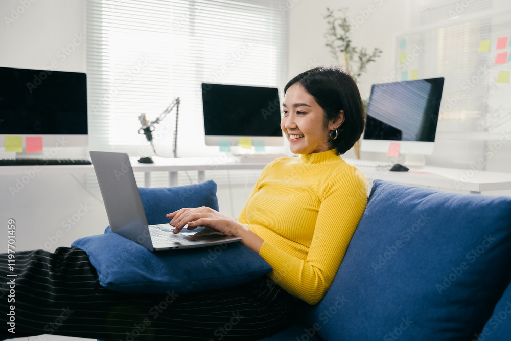 Young asian woman happily working from her cozy home office on a blue couch, typing on her laptop in bright natural light