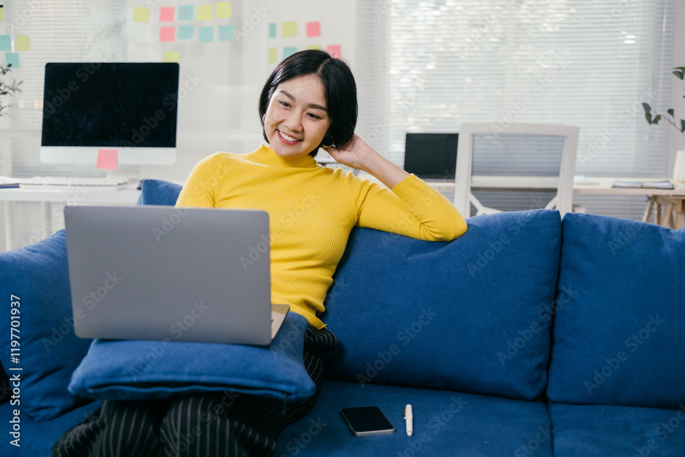 Young asian woman is working remotely, sitting comfortably on a blue sofa with her laptop. She is smiling and appears to be enjoying her work