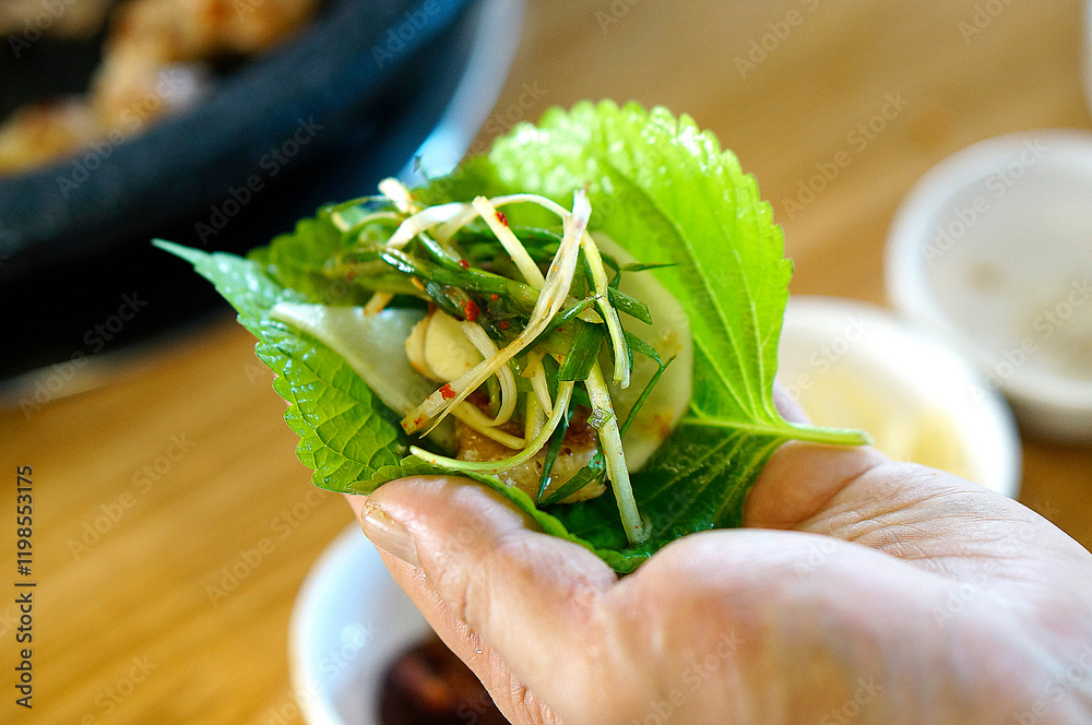 삼겹살을 깻잎에 싸서 맛있게 먹는 모습