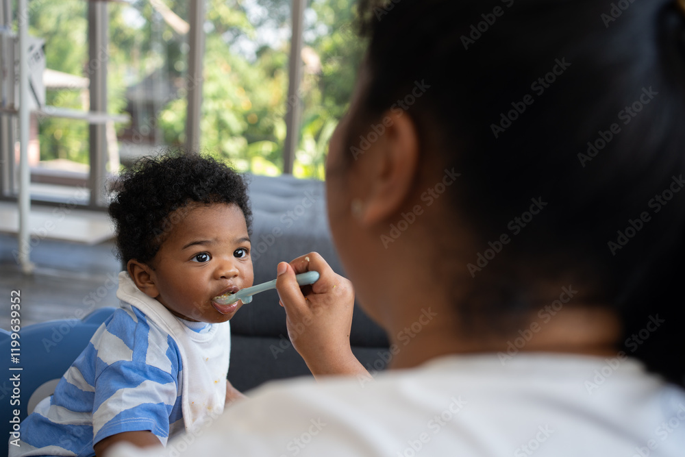 Asian mother feeding her 9 months old her cute little baby and African American helping for holding food plate At Home. Photo series of family, kids and happy people concept. Parents feed kids.