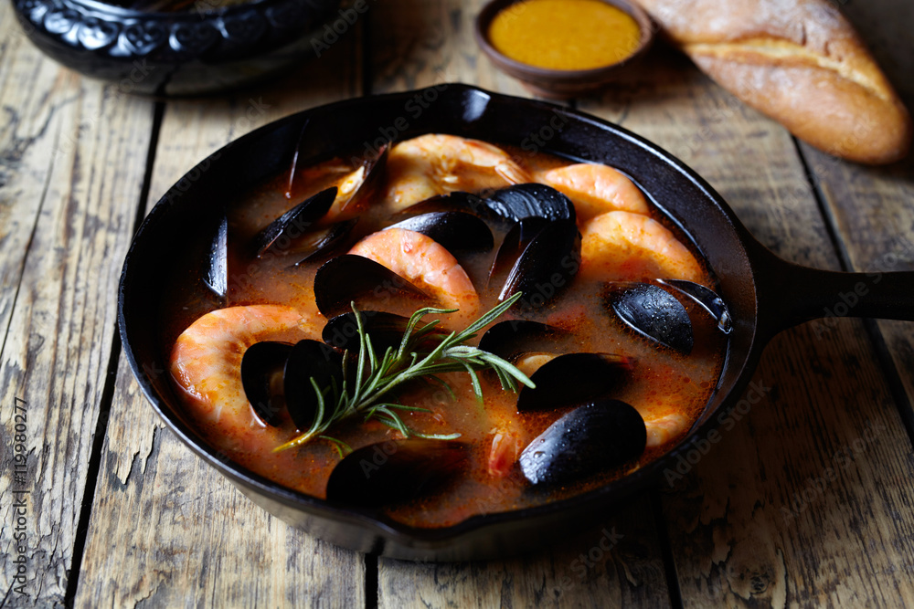 Fish soup bouillabaisse. Mussels and shrimp in tomato sauce. The traditional dish of Marseilles. He served in France and Spain. Rustic style. Flat lay.