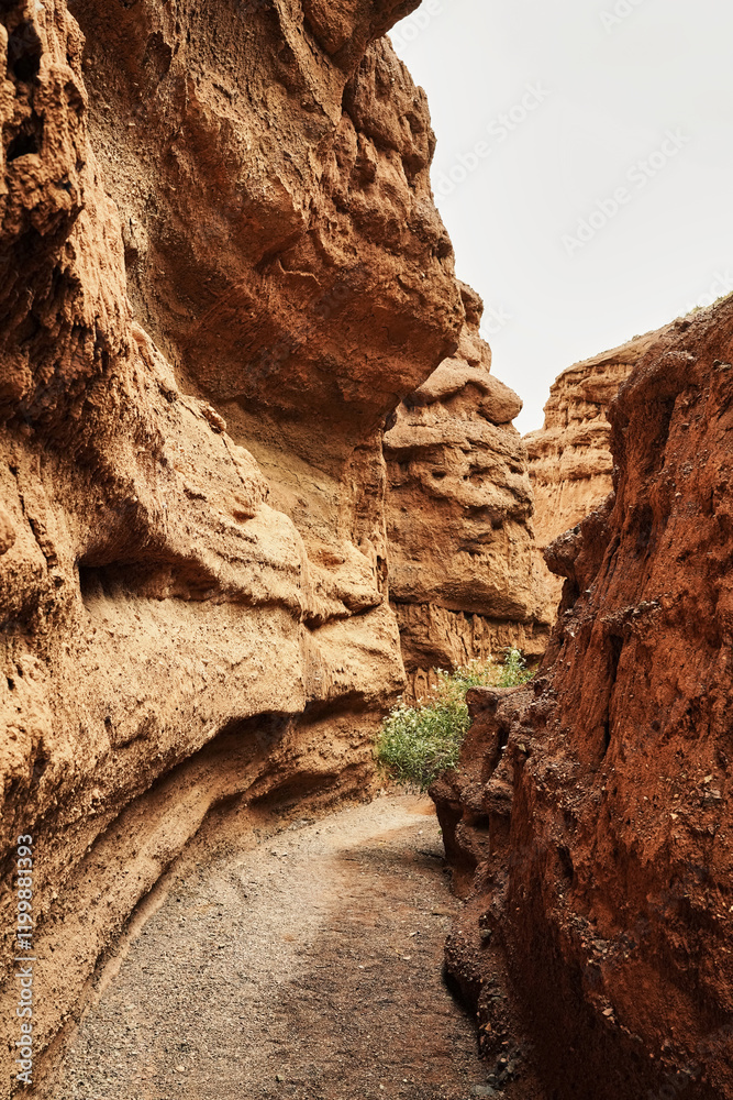 Majestic red rock walls in Kok-Moinok Canyon, Kyrgyzstan, Central Asia