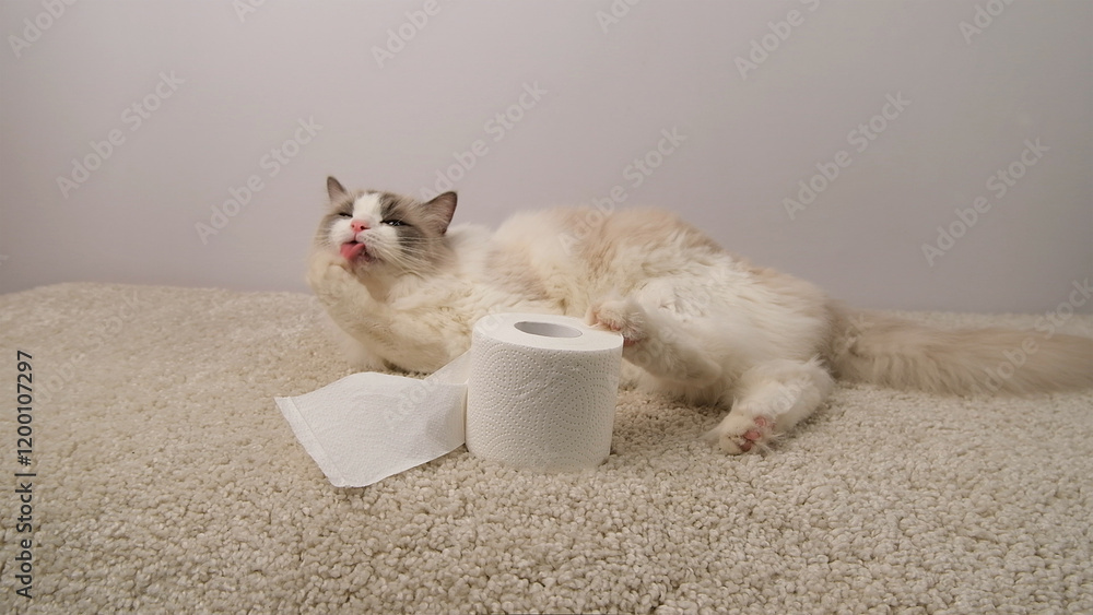 A fluffy ragdoll cat plays with a roll of white toilet paper.