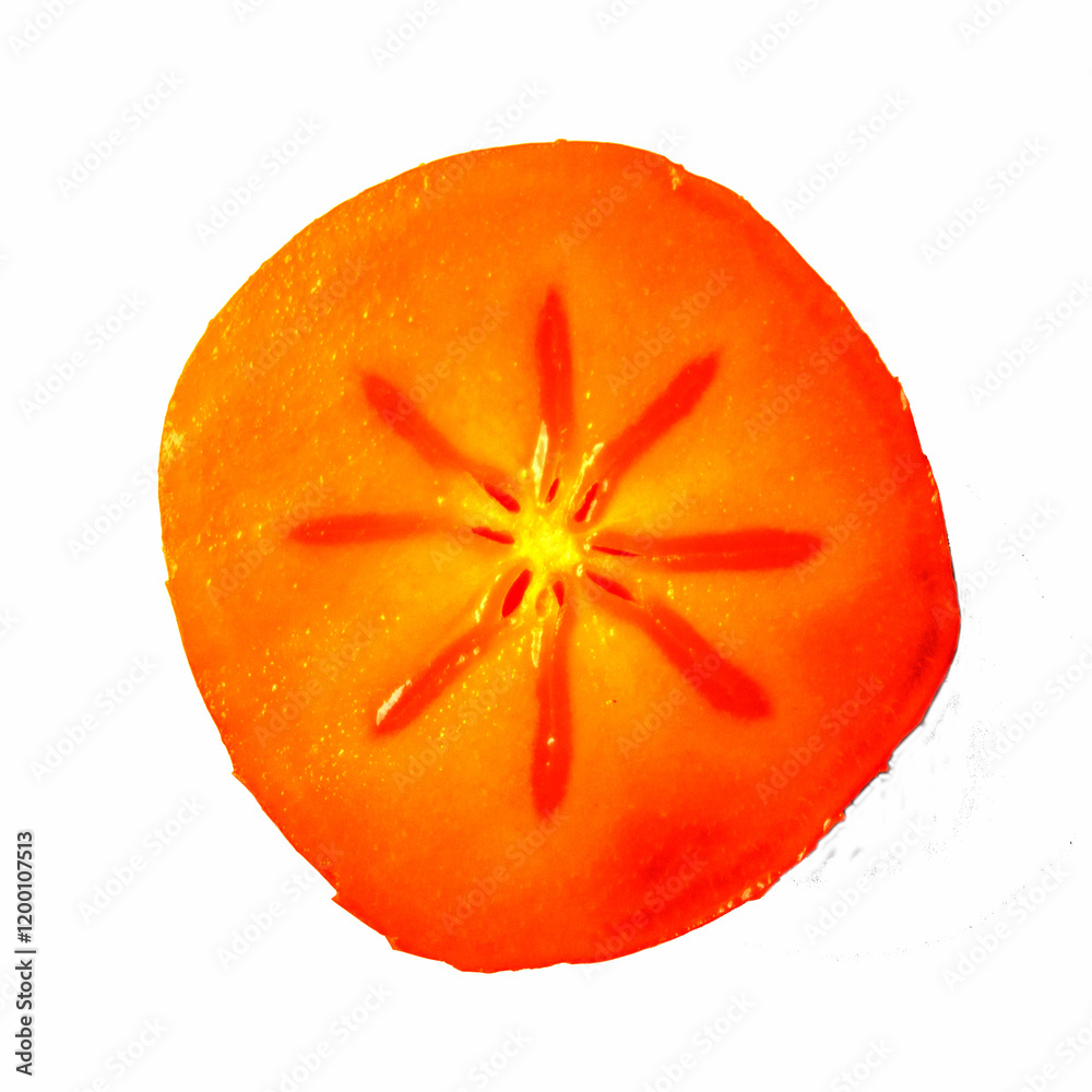 Persimmon in the section isolated on white. Half a persimmon fruit. Eight-pointed star pattern.