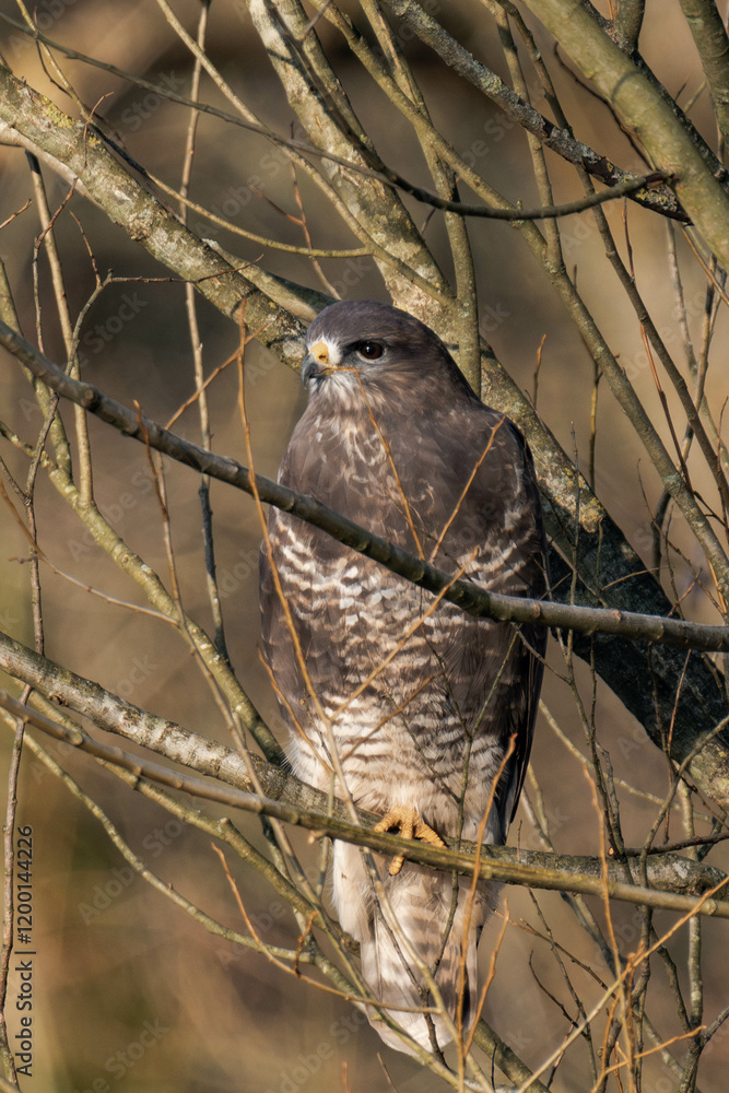 Common buzzard (Buteo buteo) sitting on a tree branch