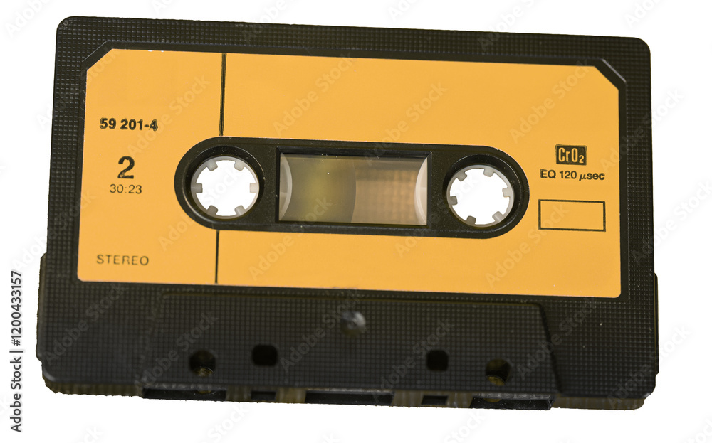Musikkasette 70er, 80er 90 Jahre, freigestellt mit Platz für Text auf gelben Untergrund