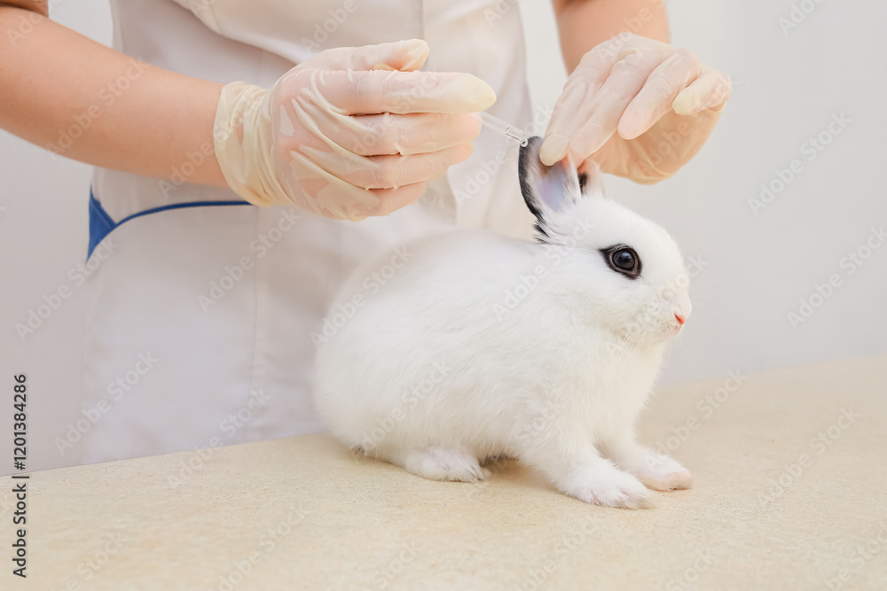 Female veterinarian puts drops in the ear of a white rabbit with panda eyes. Treatment of rabbit ear diseases, otitis, ear mites.