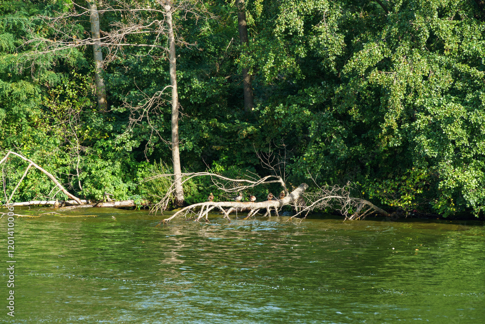 Serene riverside scene with lush greenery and fallen trees partially submerged in calm water, reflecting tranquility of nature. And with wild ducks sitting on the trunk.