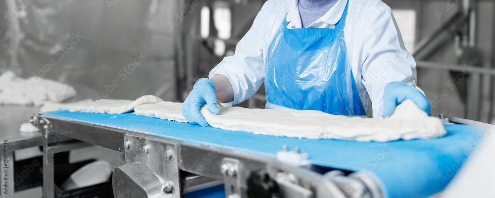Food industry worker technologist prepares puff pastry dough on automated conveyor in confectionery production
