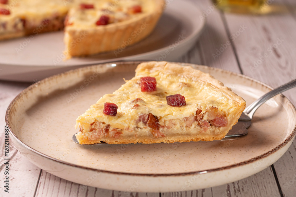 fatia de quiche lorraine em um prato de ceramica sob uma mesa de madeira clara e um quiche atrás desfocado