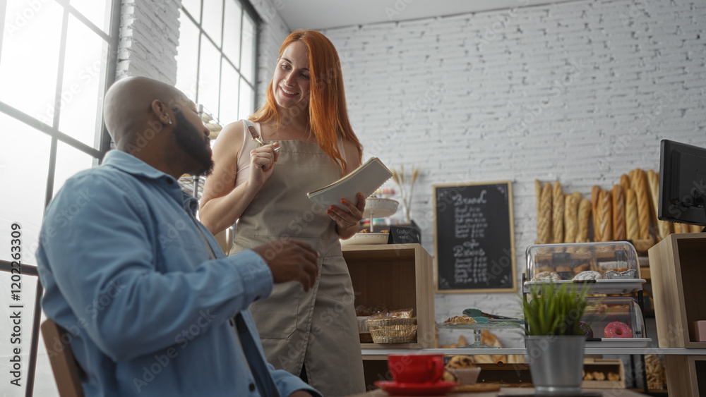 Woman waitress taking order from man customer inside cozy bakery with bread display and menu board in the background