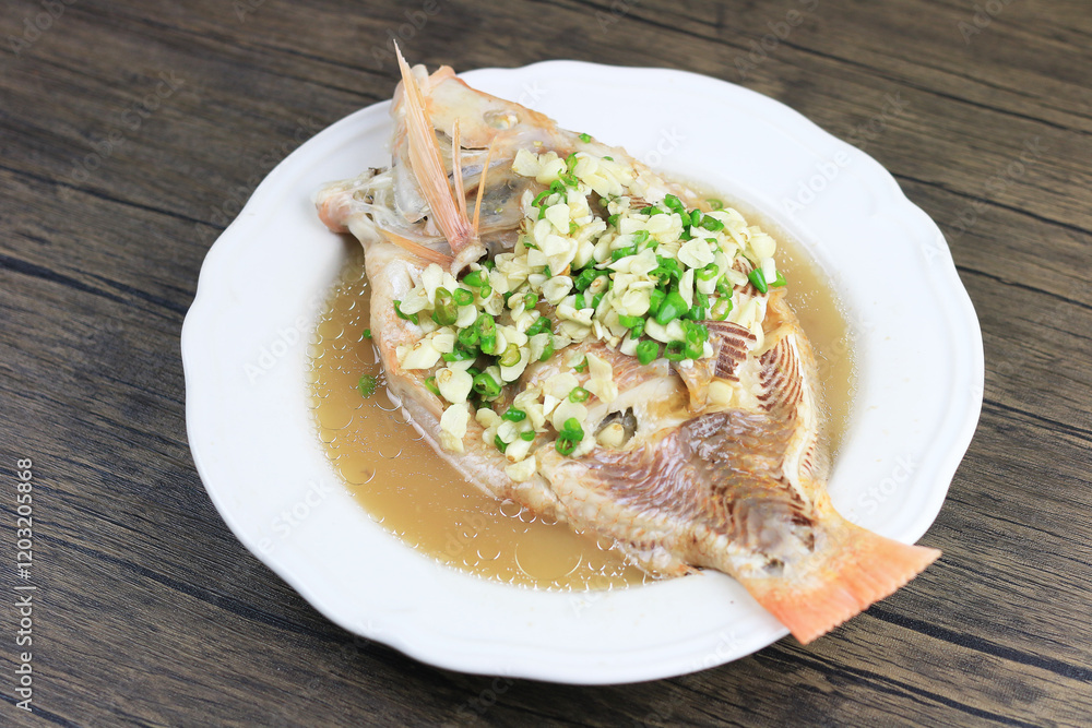 Steamed Tilapia with Spicy Chili, Garlic and Lemon Sauce with herb and vegetable on plate on wooden tanble, fish steam lime. Thai Chinese food
