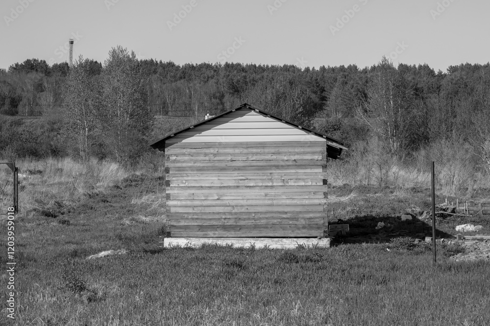 Abandoned wooden house in the village. Black and white photo.