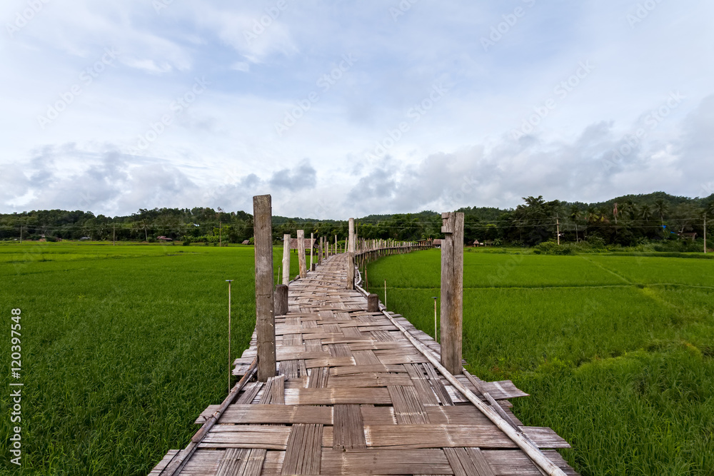 Beautiful bamboo bridge of Thailand ,Zutongpae Bridge on green rice field