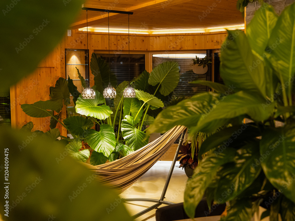 Warm and inviting green sanctuary filled with lush tropical houseplants, illuminated by stylish pendant lights. Hammock, wooden surroundings and exotic greenery in a well designed modern living space.