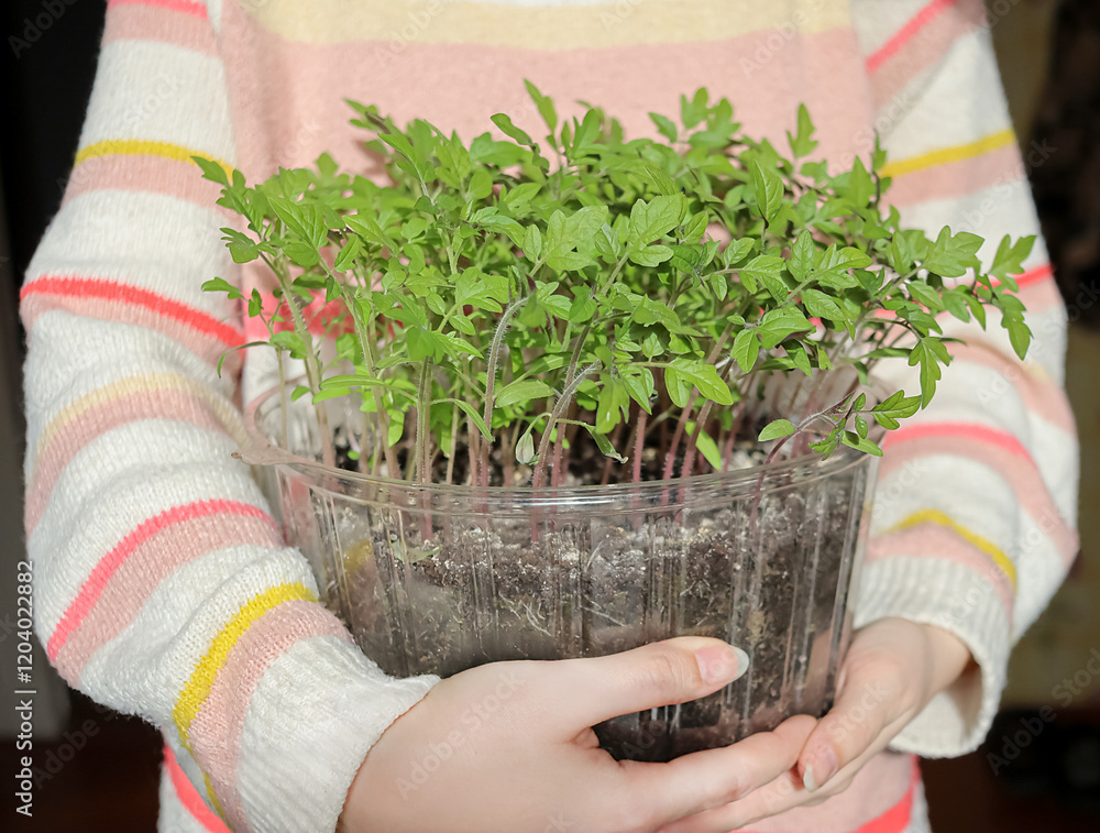 Female farmer holding large plastic pot with tomato seedlings. Growing seedlings in trays. agriculture, horticulture.