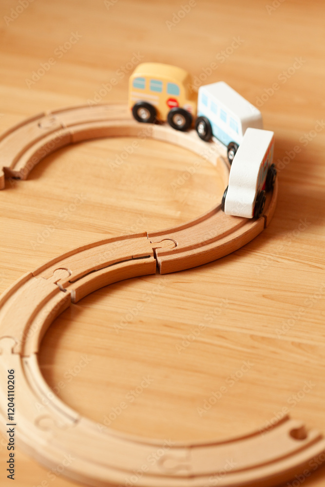 Wooden toy train on a track, curving around on a light wood surface. Cute and colorful carriages.