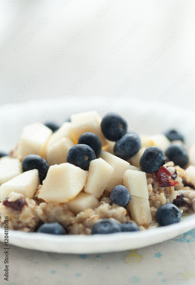 Healthy and delicious oatmeal with diced pear and blueberries. A perfect breakfast or snack!