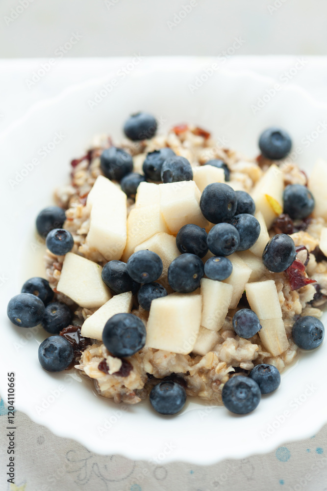 Delicious and healthy oatmeal breakfast bowl topped with fresh blueberries and diced pears.