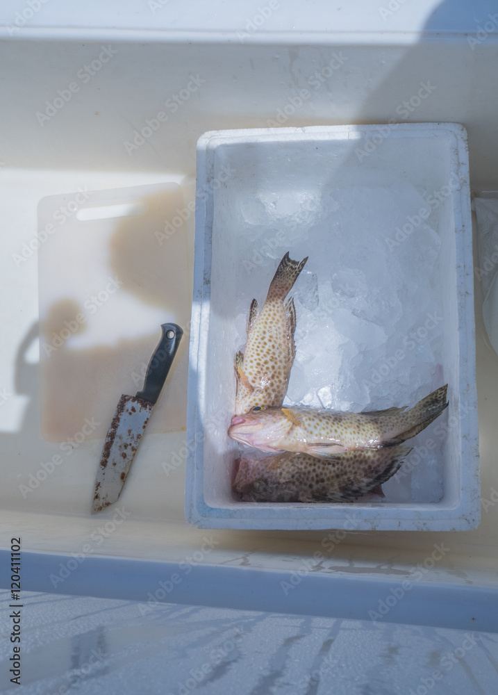 Fresh catch of grouper fish in container with ice cubes on fishing boat