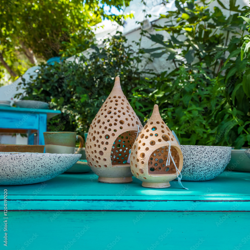 Ceramic decorations on turquoise table in Zia village, Kos island, Greece