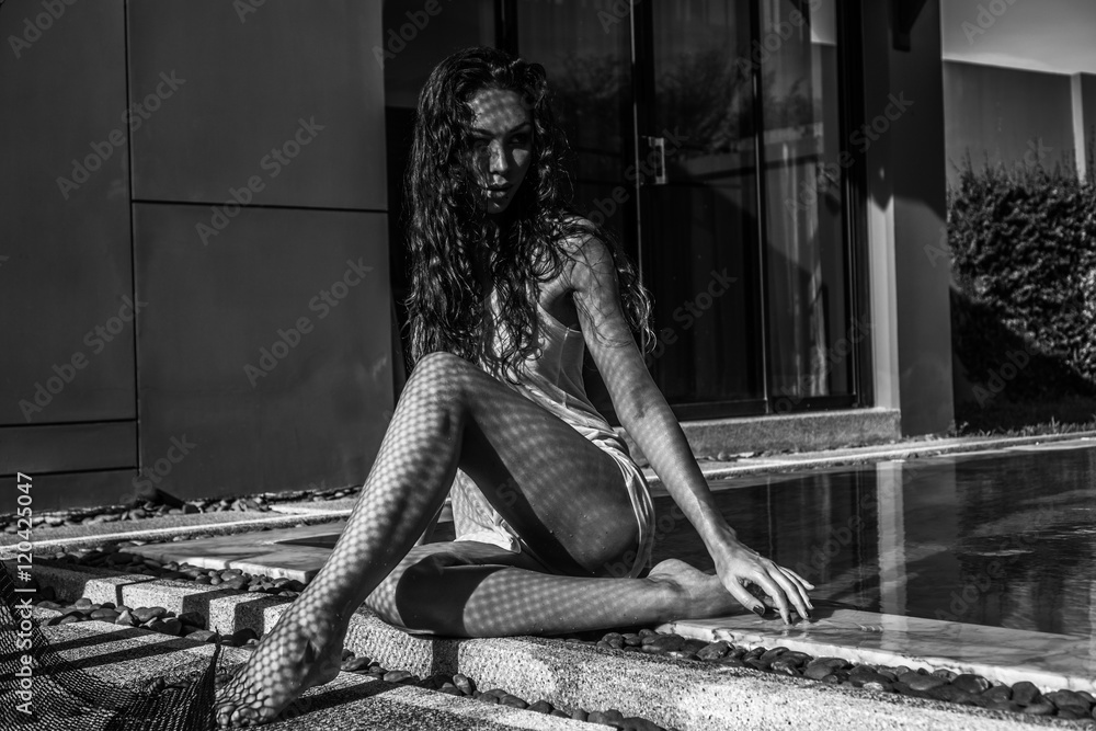 Black and white photo of beautiful seductive brunette woman posing beside the outdoor swimming pool during sunny summer day with shadow net reflection on her face and body