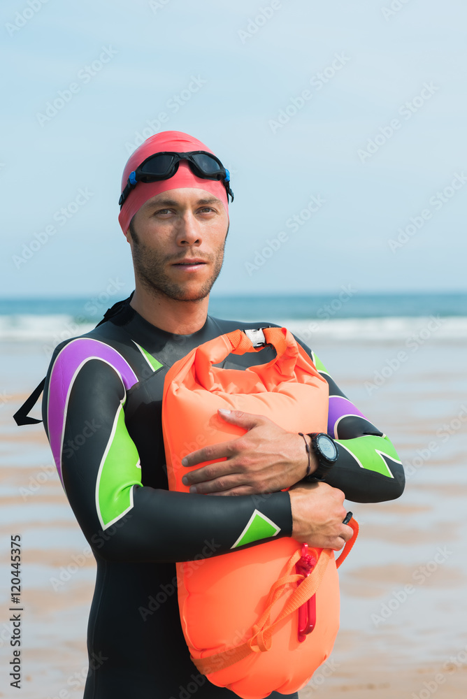 Portrait of a strong swimmer embracing swimming safety buoy motivated for his open water workout routine with goggles, cap and wet suit on a beach.