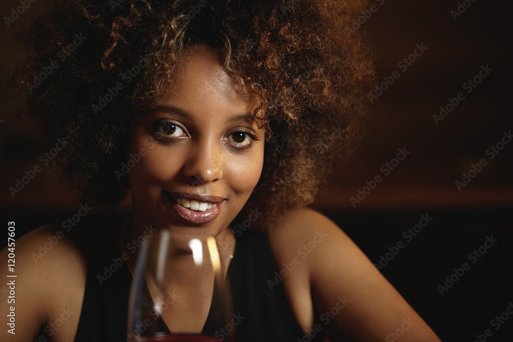 People and leisure. Attractive African female with mysterious smile and healthy shiny skin, holding glass of red wine, sitting against wooden wall background with copy space for your content