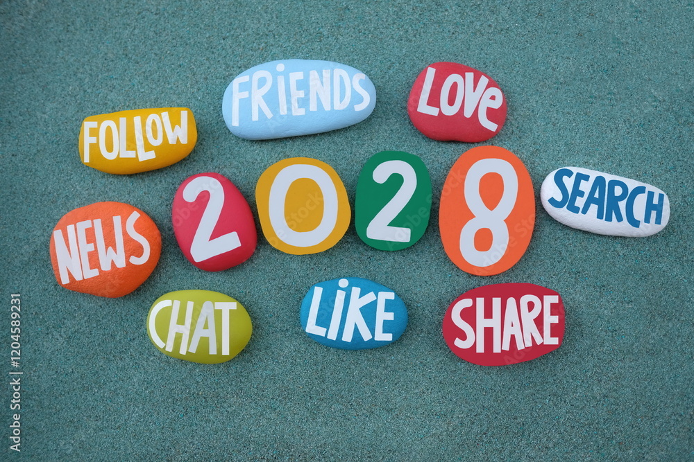 Happy 2028 full of joy, life, chat, followers, friends, love, search, news and share, creative multi colored hand painted stones over green sand