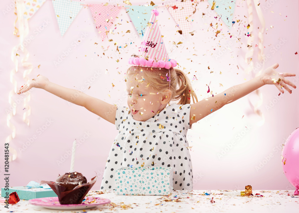 Lovely birthday girl trowing colorful confetti in the room. Cute child in pink cap having fun on party.