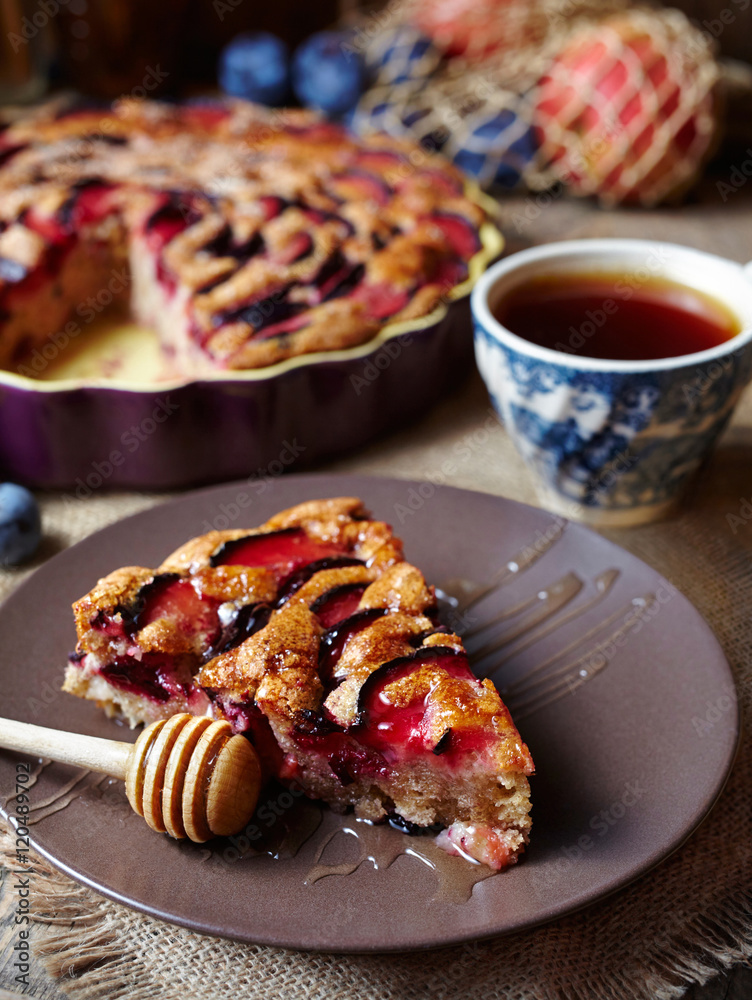 Homemade plum cake zwetschgendatschi, damsonpie on the ceramic plate with tea. Rustic style. Warm, cozy atmosphere.