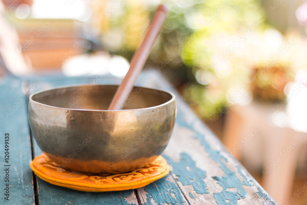 Klangschale auf rustikalem Holz